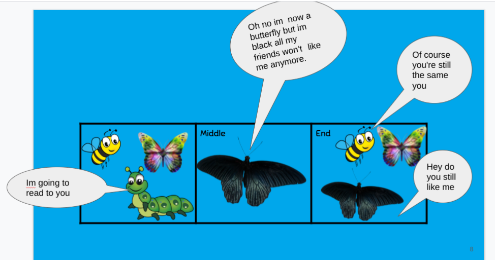 Today I made  comic strip on this story and it was very fun to make.This comic strip is very cool its about a Caterpillar , bee and a butterfly. The caterpillar loves to read to her friends and when she  hatched out of her cocoon she was black so she thought her friends wouldn't like her. opinion I think this is a very cool  comic strip it only took me about 5 to 10 minutes hope you like it. What do you like best bee , butterfly or caterpillar?